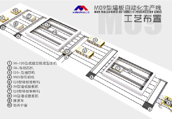 M09輕質墻板自動化生產線是由瑪納第三代輕質隔墻板立模成型機、第三代液壓抽芯機、布料系統、振動上壓成型機、推板接板合板翻板機構、集約式溫控低耗能養護室、擺渡車、中央集中控制室等重要模塊組成,它們相互配合銜接,組成標準的輕質墻板自動化生產線。