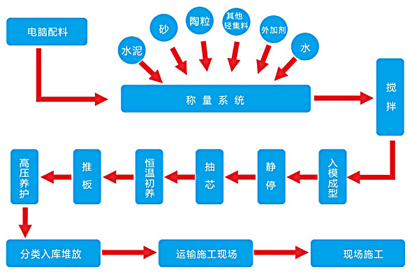 陶粒空心輕質(zhì)隔墻板生產(chǎn)線主要包括:成組立模、抽芯機(jī)、布料上面成型系統(tǒng)、出板清模系統(tǒng)、行走系統(tǒng)、蒸壓釜等功能主機(jī)。