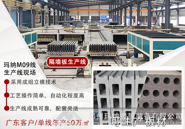 該生產線主要生產高品質普通混凝土方孔板,是瑪納公司承擔國家“十五”科技支撐項目中研制開發的一種板材,該板綜合性能穩定,是其他條式墻板中綜合性價比最高的一種板材,各型性能均優于現行國家標準。