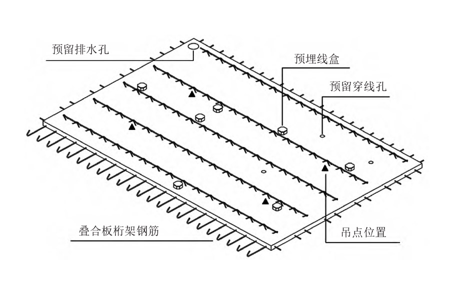 一般由設計院根據建設單位的意圖,按照現(xiàn)澆的標準和要求進行結構設計。預制構件廠在施工圖的基礎上進行拆分,將整體建筑拆分成單一構件,在充分協(xié)調各個專業(yè)之后,確保專業(yè)之間無碰撞,即完成圖紙的深化設計,深化設計圖紙包括預留預埋點位、脫模、吊裝點位及結構配筋詳圖的做法和要求,深化設計圖紙可以滿足構件加工生產和現(xiàn)場安裝的需求,本研究以疊合板深化設計詳圖為例,深化設計如下圖所示。