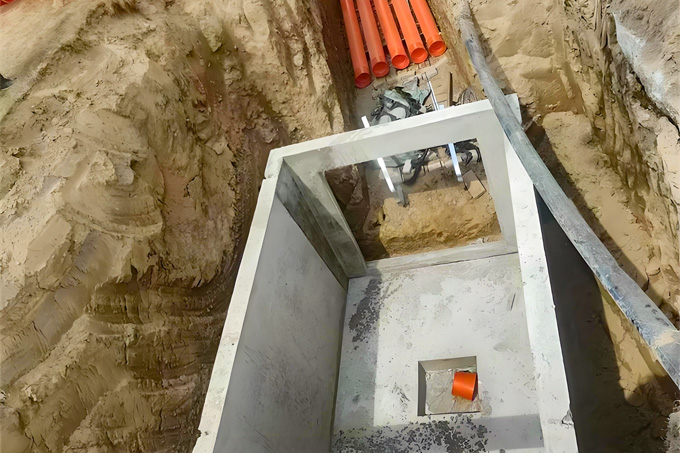工藝流程:井預(yù)制 - 放樣 - 基坑開挖 -墊層施工 - 運(yùn)輸 - 吊裝 -防水處理