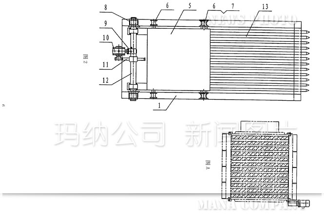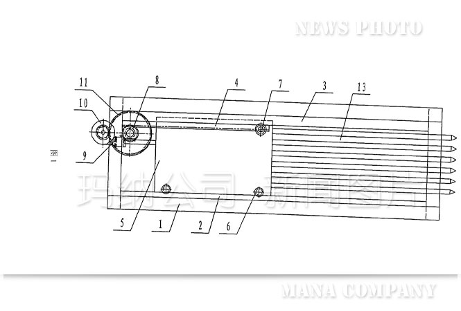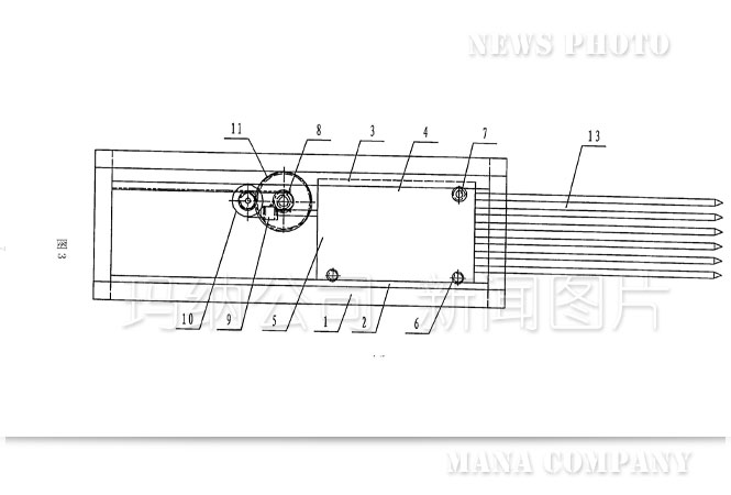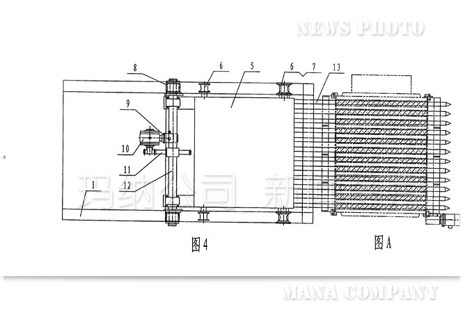 傳統的抽芯機結構(如圖1——圖4):機架1上設置有下導軌2和上導軌3,在上導軌3的后半部分固定有齒條4,行走小車5上安裝的下滑輪6、上滑輪7、小齒輪8分別與下導軌2、上導軌3、齒條4接觸并能沿之前后移動,進而帶動行走小車5前端連接的芯管13一起向前或向后移動,即完成多孔墻板在成型過程中穿、拔芯管的功能。上述運動是由電機9、減速機10、大齒輪11、傳動軸12等組成的驅動系統帶動行走小車5上的小齒輪8與齒條4相嚙合來實現的。從上述結構可以看到傳統的抽芯機動力傳動部分是機械傳動:電機9轉動——減速機10調速、換向——大齒輪11轉動——傳動軸12轉動——小齒輪8轉動與齒條4嚙合——行走小車5和芯管13前后平移,運動轉換次數多、傳動結構復雜、傳動零件種類多,從設計、制作、使用、檢修都比較麻煩,而且對芯管位移量的定位也不太精確。