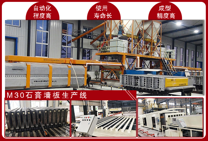 M30石膏墻板生產(chǎn)線是瑪納公司在最新研制機(jī)動(dòng)成組立模墻板成型工藝的基礎(chǔ)上,引進(jìn)國外先進(jìn)石膏墻板生產(chǎn)工藝,經(jīng)過技術(shù)創(chuàng)新,研制出的新型石膏墻板生產(chǎn)線,具有如下特性: