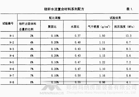在試驗室進行了近100個配方的小樣品試驗,用于測定各配方的體積密度、抗折強度和抗壓強度。配合比范圍:水泥占固體料總量的4%5~5%8.砂子占固體料總量的10%一2%3.粉煤灰占固體料總量的18%~30%,碎麥秸占固體料總量的%3~1%1;聚合物與固體料之比為0.10%~0.60%;水固比0.40~0.70.