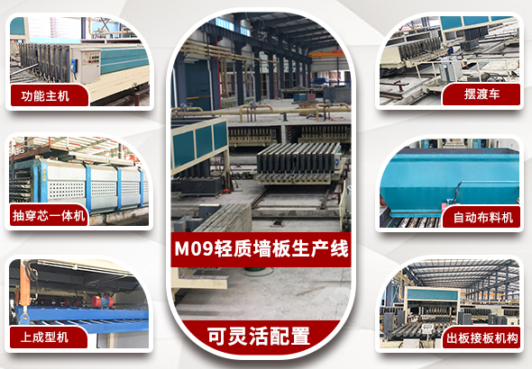 瑪納M09輕質墻板生產線主要設備組成有:①擺渡車:無線控制變頻行走及精確軌道定位,用于成組立模的轉向調度,②合板翻板機構:完成合板及翻板技術,用于板材的翻轉、打包;③推板機構:集合出板及隔板清理復合技術,配合成型立模,用于板材出模;④上成型定位機構:用于板材上成型面的定型;⑤自動布料機:配合成組立模,用于精準布料;⑥第三代液壓抽芯機:大抽拔力變量控制技術,配合成組立模,用于空心板材的抽孔穿孔;⑦第三代成組立模:不漏漿及大剛度技術,用于板材成型的主要設備。